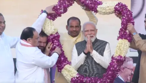 #WATCH | Prime Minister Narendra Modi being garlanded by BJP National President JP Nadda and party members on his arrival at Palam airport after concluding his three-nation visit pic.twitter.com/6K7klH2FQR