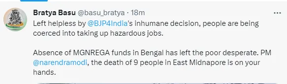 এদিন রাজ্যের শিক্ষামন্ত্রী (Bratya Basu) এক টুইট বার্তায় লেখেন, 'বিজেপির কিছু অমানবিক সিদ্ধান্তের জন্য মানুষ অসহায় হয়ে পড়েছে। বিপজ্জনক কাজ করতে মানুষকে রীতিমতো বাধ্য করা হচ্ছে। বাংলায় মনরেগা তহবিলের টাকা না পাওয়ায় দরিদ্র মানুষরা মরিয়া হয়ে উঠেছে। প্রধানমন্ত্রী নরেন্দ্র মোদী, পূর্ব মেদিনীপুরে ৯ জনের মৃত্যুর জন্য আপনিই দায়ী।'