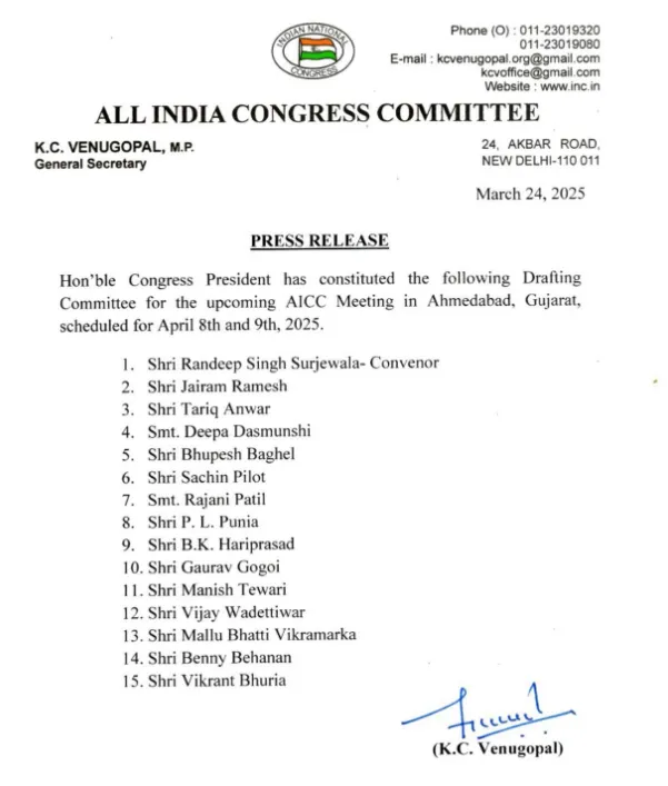Congress President has constituted a Drafting Committee for the upcoming AICC Meeting in Ahmedabad, Gujarat, scheduled for April 8th and 9th, 2025.