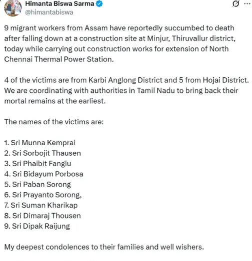 Assam CM Himanta Biswa Sarma says, "9 migrant workers from Assam have reportedly succumbed to death after falling down at a construction site at Minjur, Thiruvallur district, today while carrying out construction works for extension of North Chennai Thermal Power Station... We… pic.twitter.com/gqphtrjpRf