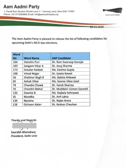 নিজস্ব সংবাদদাতা: আসন্ন ৩০ নভেম্বরের এমসিডি উপনির্বাচনকে সামনে রেখে আম আদমি পার্টি (AAP) আজ ১২ আসনের প্রার্থী তালিকা প্রকাশ করেছে। দলীয় সদর দফতরে এই তালিকা ঘোষণা করা হয় বলে সূত্রে জানা গেছে।
