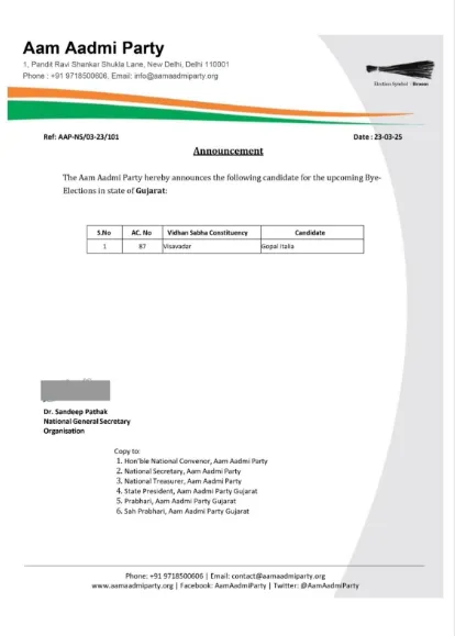 Aap Aadmi Party (AAP) fields Gopal Italia as its candidate for Visavadar Assembly by-elections in Gujarat. pic.twitter.com/BAeofQwiOh