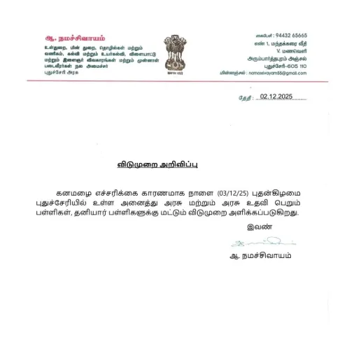 নিজস্ব সংবাদদাতা: আবহাওয়া দপ্তরের জারি করা ভারী বৃষ্টির সতর্কতার জেরে আজ বুধবার (০৩/১২/২৫) পুদুচেরির সমস্ত স্কুল বন্ধ রাখার সিদ্ধান্ত নিয়েছে কেন্দ্রশাসিত অঞ্চল প্রশাসন। শিক্ষামন্ত্রী এ. নামাচিভায়ম জানান, সরকারি, সরকার অনুমোদিত ও বেসরকারি সব শিক্ষাপ্রতিষ্ঠান একদিনের জন্য বন্ধ থাকবে।