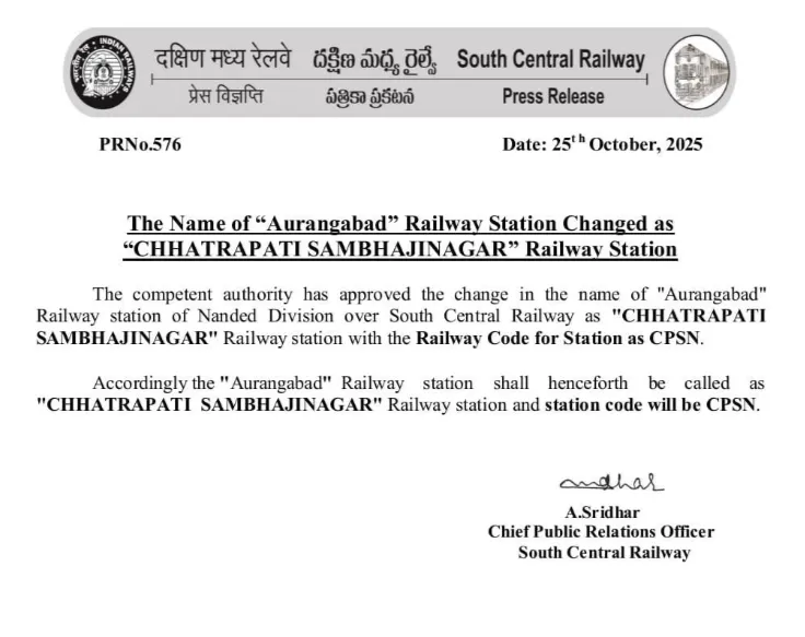 The Name of 'Aurangabad' Railway Station changed as 'Chhatrapati Sambhajinagar' Railway Station: South Central Railway pic.twitter.com/oq3QpltovG