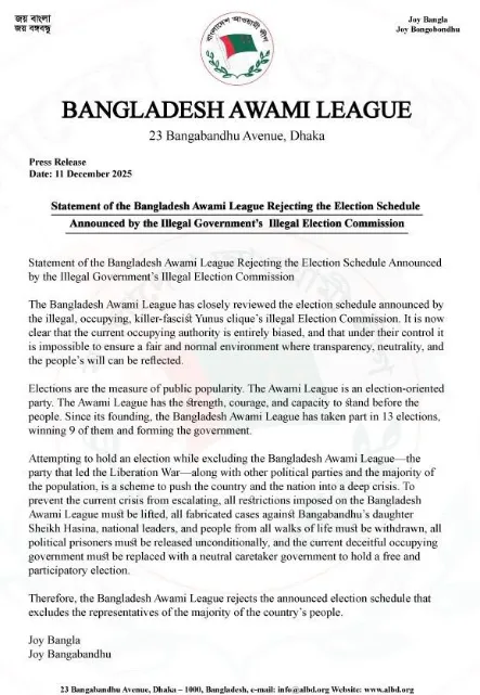 আওয়ামী লীগ জানায়, দেশের সংখ্যাগরিষ্ঠ জনগণের প্রতিনিধিদের বাদ দিয়ে ঘোষণা করা এই নির্বাচনসূচিকে তারা সম্পূর্ণভাবে প্রত্যাখ্যান করছে। দলের এই বিবৃতি বাংলাদেশের বর্তমান রাজনৈতিক টানাপোড়েন ও নির্বাচন প্রক্রিয়া নিয়ে আরও নতুন বিতর্ক তৈরি করেছে।
