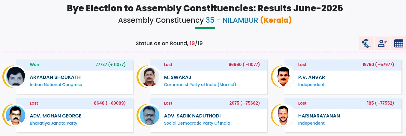 নিজস্ব সংবাদদাতা: কেরালার নিলাম্বুর উপনির্বাচনে বিজেপির ফলাফল রাজ্য রাজনীতিতে এক প্রকার হতাশার চিত্র তুলে ধরেছে। প্রথম বা দ্বিতীয় তো দূরের কথা, স্বতন্ত্র প্রার্থীর থেকেও ১১ হাজারের বেশি ভোটে পিছিয়ে চতুর্থ স্থানে অবস্থান নিয়েছে বিজেপি। এই কেন্দ্রে বিজেপি প্রার্থী মোট ৯ হাজার ভোটও পেতে পারেনি, যা একেবারে দলটির জন্য লজ্জাজনক বলে মনে করা হচ্ছে।