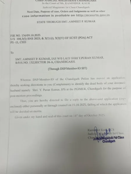 নিজস্ব সংবাদদাতা: চণ্ডীগড় আদালত আইএএস অফিসার অমনীত পি. কুমার-কে নির্দেশ দিয়েছে যে, প্রয়াত আইপিএস কর্মকর্তা ওয়াই. পুরন কুমার-এর ময়নাতদন্ত-পরবর্তী পরিচয় (post-mortem identification) সংক্রান্ত বিষয়ে তিনি ১৫ অক্টোবরের মধ্যে আদালতে জবাব দাখিল করবেন।