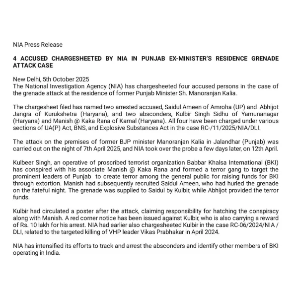 The National Investigation Agency (NIA) has chargesheeted four accused persons in the 7th April 2025 case of the grenade attack at the residence of former Punjab Minister Manoranjan Kalia. The chargesheet filed has named two arrested accused, Saidul Ameen of Amroha (UP) and… pic.twitter.com/3dfubr6E8s