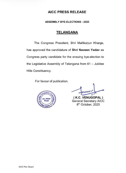 Congress announces Naveen Yadav as the party's candidate for the ensuing bye-election to the Legislative Assembly of Telangana from Jubilee Hills Constituency. pic.twitter.com/EaWhBIFs7x