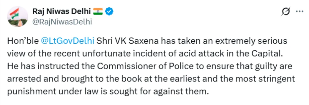 Lt Gov of Delhi VK Saxena has taken an extremely serious view of the recent unfortunate incident of acid attack in the Capital. He has instructed the Commissioner of Police to ensure that the guilty are arrested and brought to the book at the earliest, and the most stringent… pic.twitter.com/4udROGk5QL