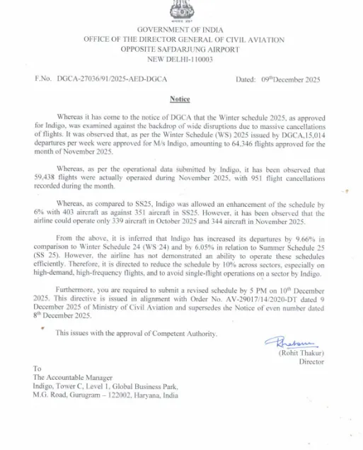 DGCA issues notice to IndiGo for reduction in winter schedule due to operational disruptions.