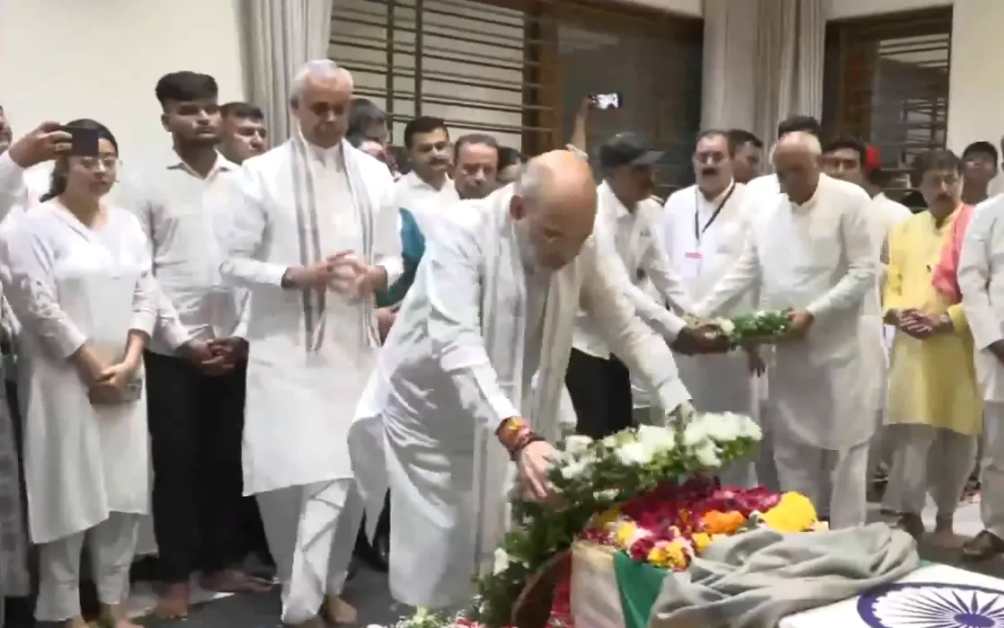 #WATCH | Rajkot: Gujarat Governor Acharya Devvrat, Union Home Minister Amit Shah and CM Bhupendra Patel pay their respects to former Gujarat CM Vijay Rupani, who lost his life in the Air India Plane crash in Ahmedabad on June 12 pic.twitter.com/BXjR9WC3AR