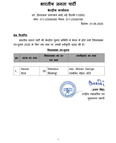 BJP announces Advocate Mohan George as the party candidate for the byelection to the Nilambur Assembly constituency