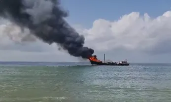 #WATCH | Gujarat | A ship anchored at Porbandar Subhashnagar Jetty caught fire.