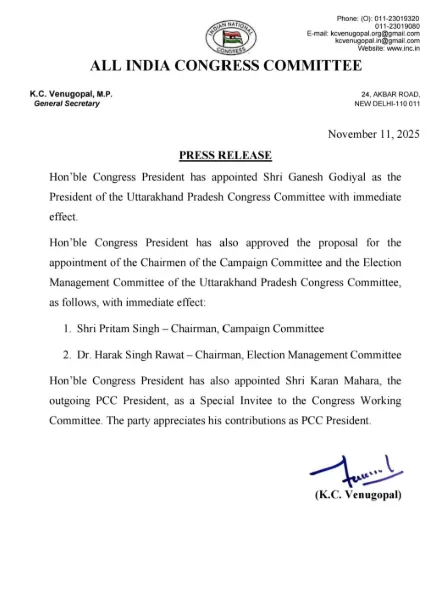 নিজস্ব সংবাদদাতা: উত্তরাখণ্ড প্রদেশ কংগ্রেস কমিটিতে গুরুত্বপূর্ণ সাংগঠনিক পরিবর্তন আনা হয়েছে। গণেশ গোদিয়ালকে নতুন প্রদেশ কংগ্রেস সভাপতি হিসেবে নিয়োগ দিয়েছে দলীয় হাইকম্যান্ড। তিনি আগে-ও এই পদে দায়িত্ব পালন করেছেন। আসন্ন ২০২৭ সালের বিধানসভা নির্বাচনের প্রস্তুতি জোরদার করতে প্রীতম সিংকে প্রচার কমিটির চেয়ারম্যান এবং হরক সিং রাওয়াতকে নির্বাচন ব্যবস্থাপনা কমিটির চেয়ারম্যান করা হয়েছে। কংগ্রেসের মতে, এই রদবদল দলের সাংগঠনিক শক্তি বাড়াবে এবং নির্বাচনমুখী প্রস্তুতিতে নতুন গতি আনবে।