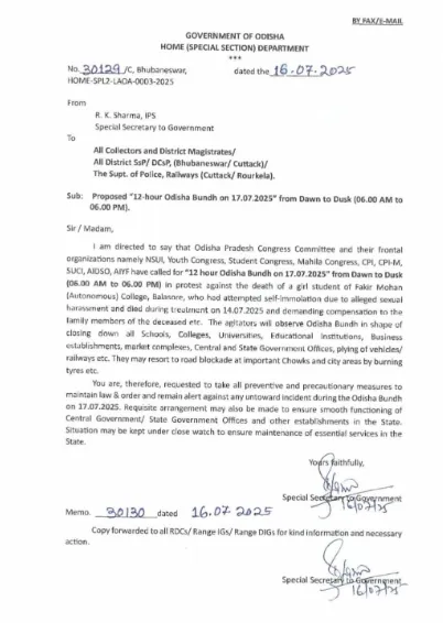 The Odisha government has directed all Collectors and SPs to take preventive and precautionary measures to maintain law and order and remain alert to any untoward incidents during the 12-hour bandh called by Congress and Left parties over the death of a Balasore FM Autonomous… pic.twitter.com/LK1ZKtN3MV