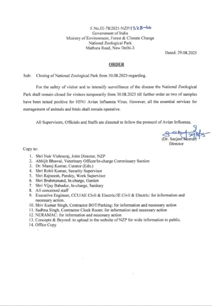 National Zoological Park, Mathura Road, New Delhi to remain closed for visitors temporarily from 30.08.2025 till further order as two samples have tested positive for H5N1 Avian Influenza Virus. pic.twitter.com/7BWBsV0HnU