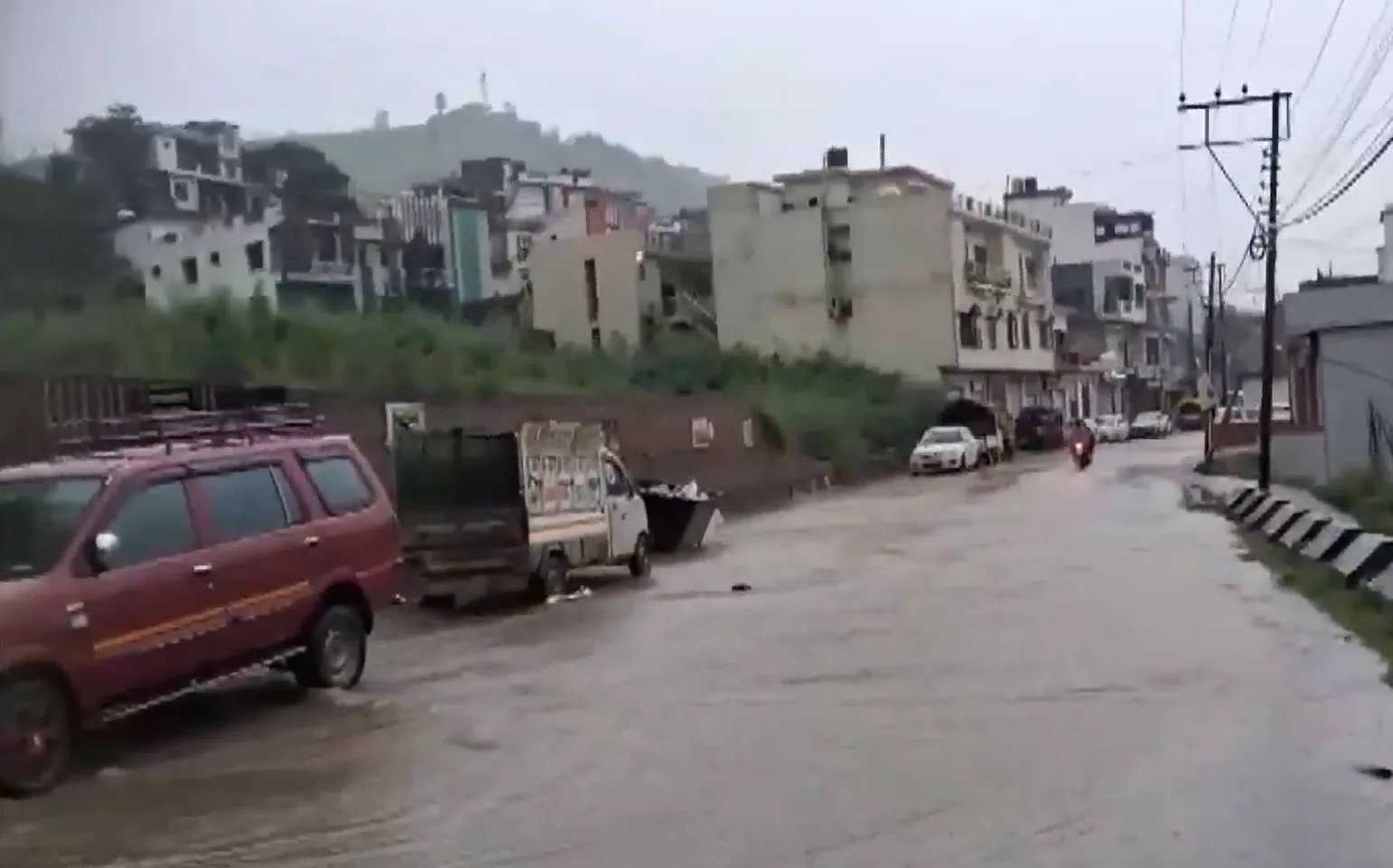 #WATCH | J&K | Flood-like situation in Rajouri after Dharhali and Saktoh rivers experience rising water levels following incessant rainfall in the area