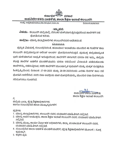 Kalaburagi, Karnataka | Deputy Director (Administration) Department of School Education Kalaburagi announced holiday for schools in the district on September 27 and 28, as a precautionary measure in view of heavy rain and orange alert for the district. pic.twitter.com/cTycYEQiPF