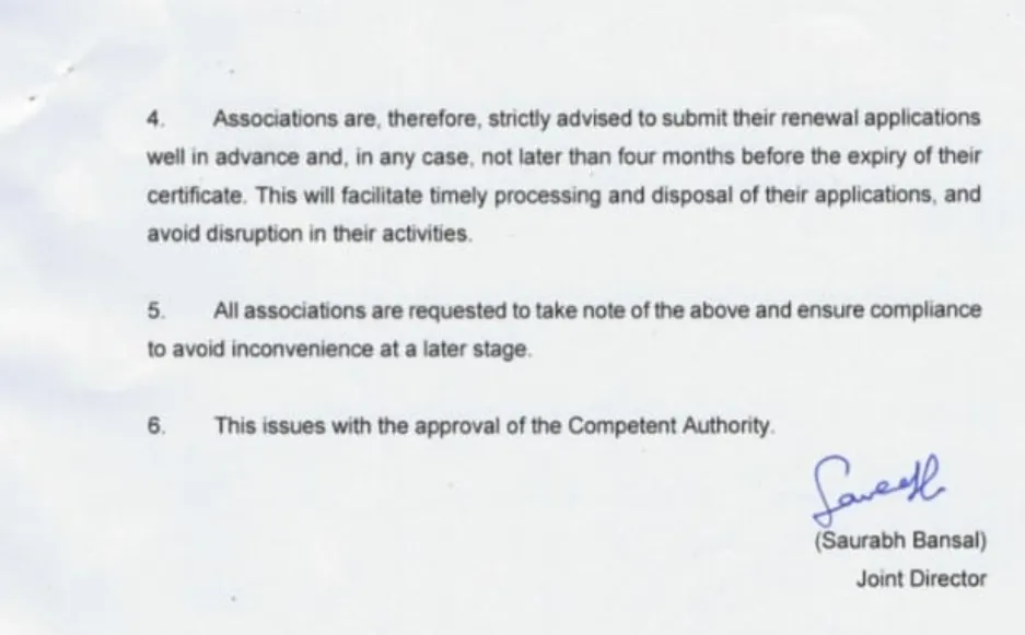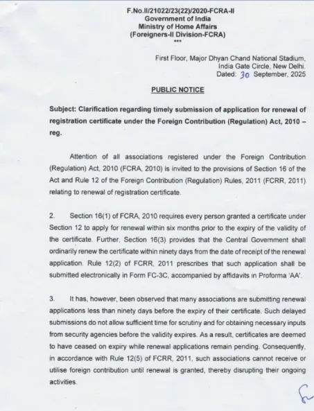 Ministry of Home Affairs today issued a directive to all non-governmental organisations to submit applications for renewal of their Foreign Contribution (Regulation) Act registration at least four months before expiry. pic.twitter.com/pJb9SrQD53