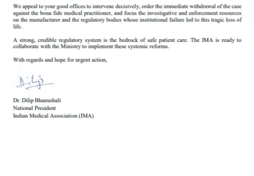 The Indian Medical Association (IMA) has written to Union Health Minister JP Nadda expressing urgent concern over the arrest of a distinguished paediatrician in the Madhya Pradesh cough syrup tragedy and the urgent need for systemic drug quality reforms. pic.twitter.com/MuvJPORWMf