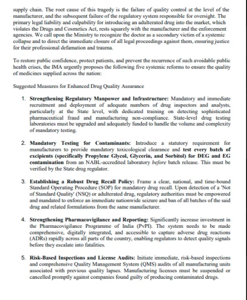 আইএমএর মতে, এই ঘটনা কেবলমাত্র একজন চিকিৎসকের বিষয় নয়, বরং ভারতের ওষুধ মাননিয়ন্ত্রণ ব্যবস্থার একটি বড় ত্রুটি প্রকাশ করছে। সংগঠনটি সরকারের কাছে তাৎক্ষণিক সংস্কারমূলক পদক্ষেপ নেওয়ার আহ্বান জানিয়েছে, যাতে ভবিষ্যতে এমন ঘটনা এড়ানো যায়। আইএমএর দাবি, “চিকিৎসকদের অযথা দোষারোপ না করে প্রকৃত দায়িত্বপ্রাপ্ত সংস্থা ও মাননিয়ন্ত্রণ প্রক্রিয়ার ব্যর্থতার দিকেই নজর দেওয়া উচিত।”