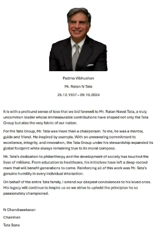মৃত্যুকালে তিনি মুম্বাইয়ের ব্রিচ ক্যান্ডি হাসপাতালে ভর্তি ছিলেন। ১৯৯১ সালে তিনি টাটা গোষ্ঠীর চেয়ারম্যান হন। তার মৃত্যুতে শোকের ছায়া নেমে এসেছে দেশ জুড়ে।
