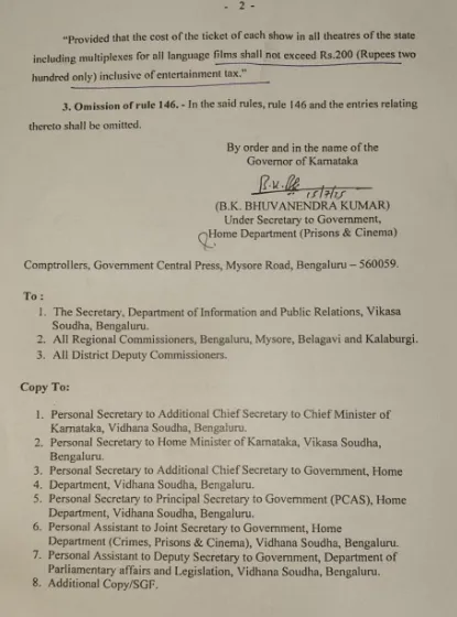 Karnataka Government orders fixing the price for the movie tickets across the state including multiplexes. The prices of tickets should not exceed Rs 200 inclusive of entertainment tax. pic.twitter.com/CVOQjNTvHv
