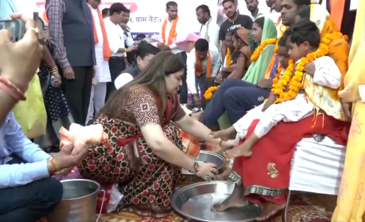 #WATCH | Kabirdham, Chhattisgarh: Pandaria MLA Bhavna Bohra greets 115 tribals on their 'Ghar Wapasi' by washing their feet at 'Janjati Sanskriti aur Gaurav ka Janjagran' program pic.twitter.com/szUAa8unte