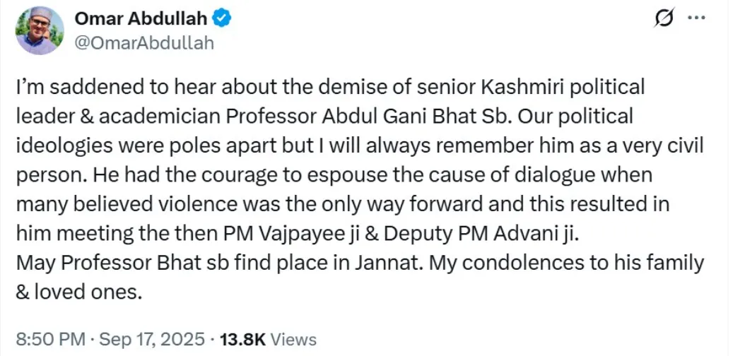 J&K Chief Minister Omar Abdullah tweets, "I’m saddened to hear about the demise of senior Kashmiri political leader & academician Professor Abdul Gani Bhat. Our political ideologies were poles apart but I will always remember him as a very civil person..." pic.twitter.com/zybX52yWPt
