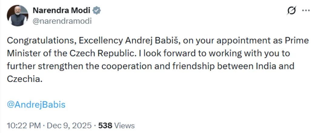 Prime Minister Narendra Modi tweets, "Congratulations Andrej Babiš, on your appointment as Prime Minister of the Czech Republic. I look forward to working with you to further strengthen the cooperation and friendship between India and Czechia." pic.twitter.com/35bqSu65es