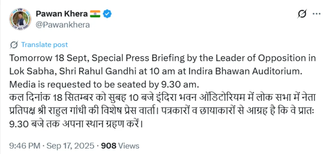 Lok Sabha LoP Rahul Gandhi to hold a special press briefing tomorrow, 18th September at 10 am at Congress Headquarters. pic.twitter.com/HVSQdyPuWS