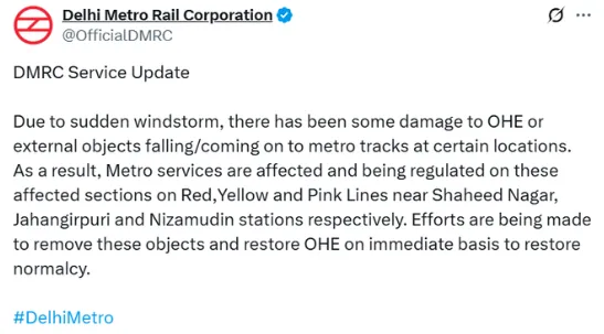 DMRC issues a service update. Due to sudden windstorm, there has been some damage to OHE or external objects falling/coming onto metro tracks at certain locations. As a result, Metro services are affected and being regulated on these affected sections on Red, Yellow and Pink… pic.twitter.com/oXzGBqjn0L
