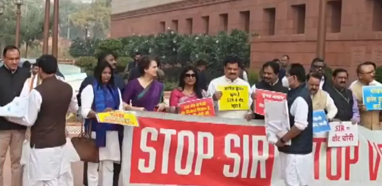 #WATCH | Delhi | Opposition leaders hold protest against SIR in Parliament premises, on the second day of the winter session pic.twitter.com/E4XASDuiMz