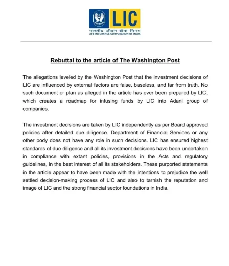 এলআইসি এক সরকারি বিবৃতিতে জানায়, “ওয়াশিংটন পোস্টে প্রকাশিত অভিযোগগুলি সম্পূর্ণ মিথ্যা, ভিত্তিহীন এবং সত্য থেকে বহু দূরে। LIC কখনও এমন কোনও নথি বা পরিকল্পনা তৈরি করেনি, যেখানে আদানি গ্রুপে তহবিল বিনিয়োগের জন্য কোনও রোডম্যাপ প্রস্তুতের কথা বলা হয়েছে।”