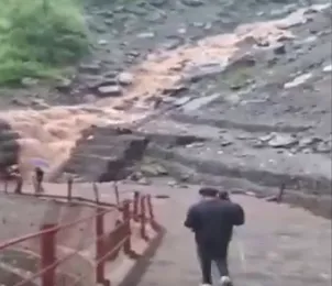 #WATCH | Rudraprayag, Uttarakhand: The path leading to Shri Baba Kedarnath Dham was damaged due to debris and stone falling in the ravine near Jangalchatti.