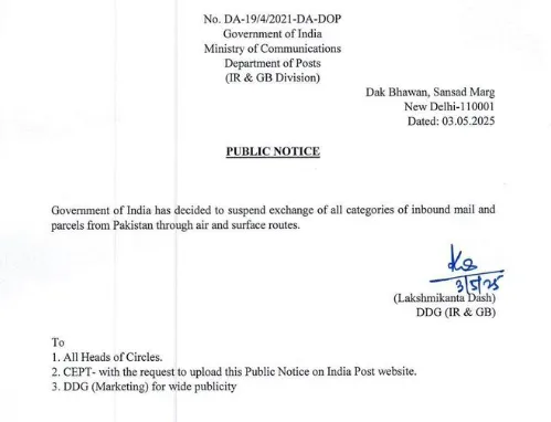 নিজস্ব সংবাদদাতা: এবার পাকিস্তানের বিরুদ্ধে ফের বড় সিদ্ধান্ত নেওয়া হয়েছে। ভারত সরকার পাকিস্তান থেকে আকাশপথে এবং ভূপৃষ্ঠে সকল ধরণের আগত ডাক এবং পার্সেল আদান-প্রদান স্থগিত করার সিদ্ধান্ত নিয়েছে, ভারত সরকারের যোগাযোগ মন্ত্রণালয়ের এক বিজ্ঞপ্তিতে বলা হয়েছে।