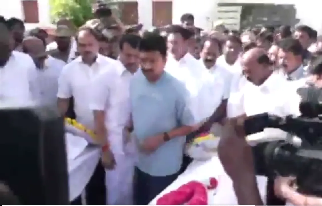 #WATCH | Karur, Tamil Nadu | Deputy CM and DMK leader Udayanidhi Stalin reaches the mortuary of the Government Medical College and Hospital to meet the kin of those deceased in the stampede that took place in Karur.