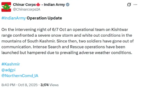 Chinar Corps, Indian Army tweets, "On the intervening night of 6/7 Oct, an operational team on Kishtwar range confronted a severe snow storm and whiteout conditions in the mountains of South Kashmir. Since then, two soldiers have gone out of communication. Intensive Search and… pic.twitter.com/2u9KPz1ap3