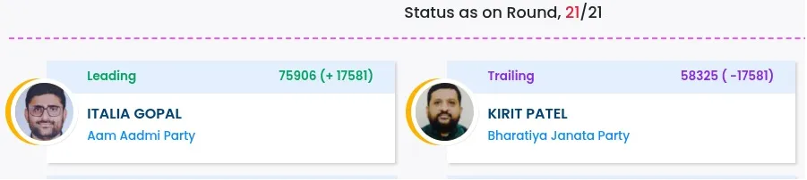 " নিজস্ব সংবাদদাতা: দিল্লিতে আপকে হারিয়ে সরকার গড়েছে বিজেপি। এবার গুজরাটে উপনির্বাচনে তার বদলা নেওয়ার পথে আপ। গুজরাটের ভিসাভাদর উপনির্বাচনে শেষ রাউন্ডের গণনাতেও অনেকটাই এগিয়ে আপ প্রার্থী। দ্বিতীয় স্থানে রয়েছে বিজেপি। "