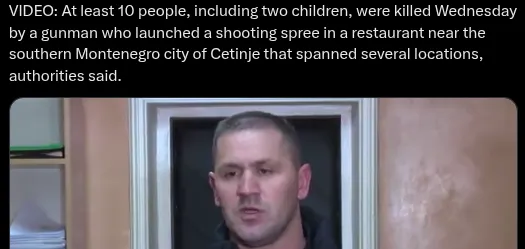 বন্দুকধারীর দ্বারা বুধবার দুই শিশুসহ অন্তত ১০ জন নিহত হয়েছেন দক্ষিণ মন্টেনিগ্রোর সেটিনজেতে। একটি রেস্তোরাঁয় গণগুলির ঘটনা ঘটেছে। ঘটনায় চাঞ্চল্য ছড়িয়েছে।