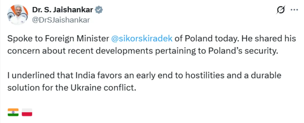 EAM Dr S Jaishankar tweets, "Spoke to Foreign Minister Radosław Sikorski of Poland today. He shared his concern about recent developments pertaining to Poland’s security. I underlined that India favours an early end to hostilities and a durable solution for the Ukraine conflict." pic.twitter.com/mbQhPUZ9hj