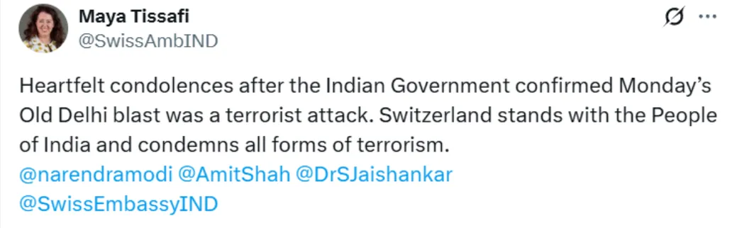 Ambassador of Switzerland to India, Maya Tissafi tweets, "Heartfelt condolences after the Indian Government confirmed Monday’s Old Delhi blast was a terrorist attack. Switzerland stands with the People of India and condemns all forms of terrorism." pic.twitter.com/Tlbf9YuFjn