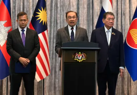 নিজস্ব সংবাদদাতা: দক্ষিণ-পূর্ব এশিয়ার দুই প্রতিবেশী রাষ্ট্র থাইল্যান্ড ও কাম্বোডিয়ার মধ্যে চলমান সীমান্ত সংঘর্ষ অবসানের লক্ষ্যে অবিলম্বে ও শর্তহীন যুদ্ধবিরতিতে সম্মত হলেন দুই দেশের নেতা। মালয়েশিয়ার প্রধানমন্ত্রী আনোয়ার ইব্রাহিম সোমবার এই তথ্য জানিয়েছেন। মালয়েশিয়ায় আয়োজিত এক দ্বিপাক্ষিক বৈঠকের পর আনোয়ার বলেন, “দুই দেশের সরকারই সর্বসম্মতভাবে সিদ্ধান্ত নিয়েছে—তৎক্ষণাৎ এবং শর্তহীনভাবে যুদ্ধবিরতি কার্যকর করা হবে, যাতে সংঘর্ষের অবসান ঘটে এবং মানবিক সংকট আর না বাড়ে।”