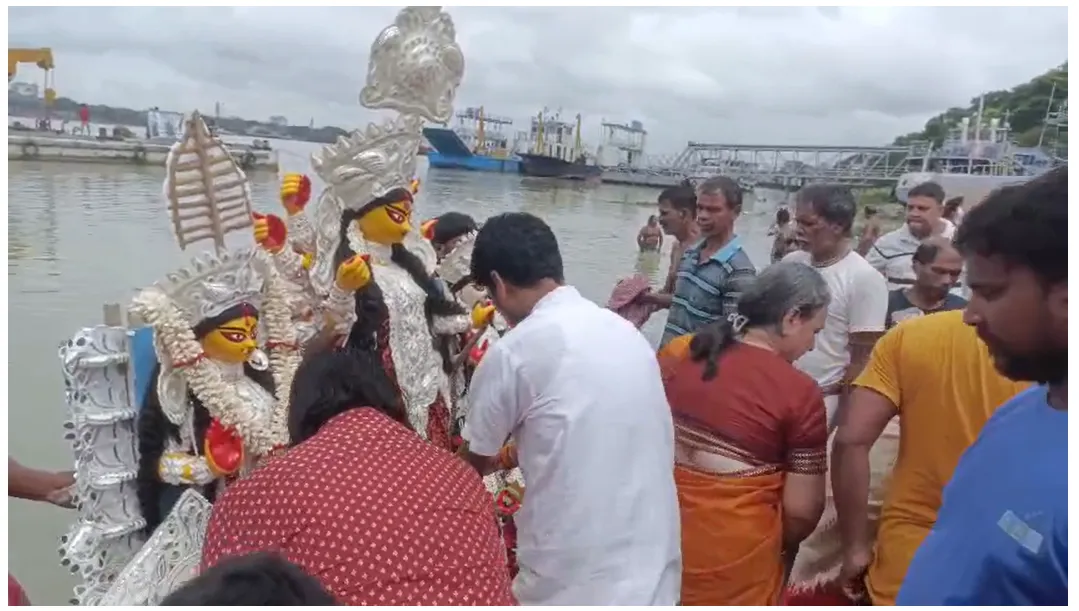 নিজস্ব সংবাদদাতা: ‘মা আসছে’— সেই আনন্দের আবেগকে বিদায় জানিয়ে এবারের মতো কৈলাশযাত্রায় পা বাড়ালেন দেবী দুর্গা। নিয়ম মেনে বৃহস্পতিবার সকাল থেকেই বাবুঘাটে শুরু হয়েছে প্রতিমা বিসর্জনের আচার। বৃষ্টির মাঝেই ঘাটে ভিড় জমাচ্ছেন ভক্তরা।