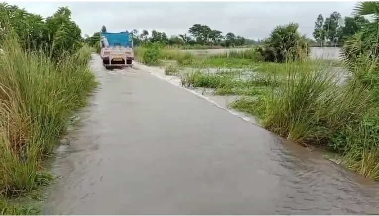 কয়েকদিন আগেও এই নদীর নীচ দিয়ে হাঁটু সমান জলে হেঁটে নদীপারের ঝুঁকির ও চরম ভোগান্তির ছবি দেখা গিয়েছিল ।ফের জল বাড়ায় গ্রামবাসীদের উদ্যোগে নৌকার ব্যবস্থা করা হয়েছে তাতেই ঝুঁকি নিয়ে নদী পারাপার করছে ঘোষকিরা সহ আরও ৫-৬ টি গ্রামের মানুষজন।এই নদী পেরিয়ে স্কুল কলেজ,স্বাস্থ্য কেন্দ্র থেকে প্রশাসনিক বিভিন্ন দপ্তর ও নিত্যপ্রয়োজনে বাজারহাটেও যেতে হয়।গ্রাম পঞ্চায়েতের তৈরি কাঠের সেতু আগেই বন্যায় ভেঙে গিয়েছে,তারপর থেকে নদীর জল কমা বাড়ার সাথে ঘোষকিরা সহ একাধিক গ্রামের বাসিন্দাদের নদী পারাপারে কখনও নৌকা আবার জল কমলে নদীর চরে হাঁটু সমান জলে হেঁটে পার হতে হয়।এতেই ক্ষোভ বাড়ছে এলাকাবাসীর,কাঠের সেতু মেরামত বা স্থায়ী কোনো বন্দোবস্ত হলে তবেই রেহাই মিলবে এই নদী পারাপারে এমনটাই জানাচ্ছেন ভুক্তভোগীরা।একদিনের এক নাগাড়ে বৃষ্টি,এখনও পরিস্থিতির কোনো পরিবর্তনের লক্ষ্মণ নেই।নদীর জল যেহারে বাড়ছে তাতে ফের না বন্যা পরিস্থিতির তৈরি হয় আশঙ্কায় চন্দ্রকোনার নদীতীরবর্তী এলাকার বাসিন্দারা।অপরদিকে টানা বৃষ্টির জেরে বৃষ্টির জল জমে জলমগ্ন চাষের জমি থেকে মাঠঘাট,সেই জল উঠলো রাজ্যসড়কে।চন্দ্রকোনায় কালিকাপুর থেকে ঝাঁকরা হয়ে কেশুরগেড়িয়া যাওয়ার রাস্তায় পিংলাস চাতালের উপর দিয়ে বইছে বৃষ্টির জল।জলের উপর দিয়ে চলছে যাতায়াত।