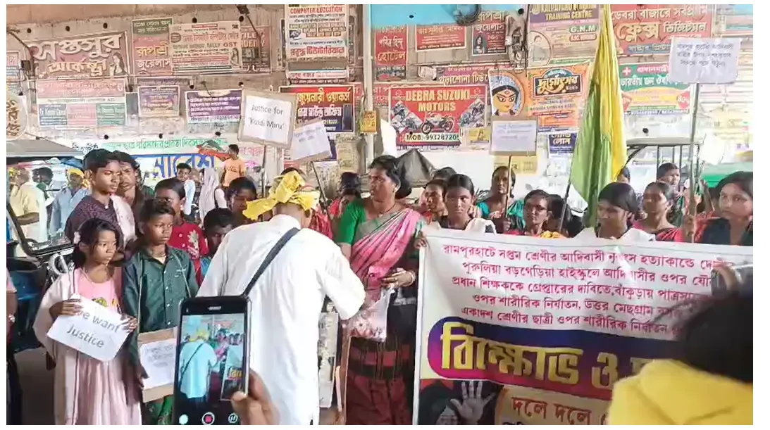নিজস্ব সংবাদদাতা: পশ্চিম মেদিনীপুর জেলার ডেবরা ব্লকের ডেবরা বাজারে ভারত জাকাত মাজি পরগনা মহল ডেবরা মুলুকের পক্ষ থেকে বিক্ষোভ ও সমাবেশ করা হয়। মূলত, রামপুরহাটে সপ্তম শ্রেণির আদিবাসী ছাত্রীর নৃশংস হত্যাকাণ্ডে দোষীদের ফাঁসির দাবিতে, পুরুলিয়ার বড়গেড়িয়া হাইস্কুলে আদিবাসী সম্প্রদায়ের মেয়ের উপর যৌন হেনস্থার জড়িত প্রধান শিক্ষককে গ্রেপ্তারের দাবিতে, বাঁকুড়ার পাত্র সায়েরে আদিবাসী ছাত্রীর ওপর শারীরিক নির্যাতন, উত্তর মেছগ্রামে বসন্ত আবাস শিক্ষাসদনে একাদশ শ্রেণির ছাত্রী ওপর শারীরিক নির্যাতন ও শ্লীলতাহানির ঘটনা সহ একাধিক বিষয় নিয়ে ডেবরাতে বিক্ষোভ ও সমাবেশ সংগঠিত হয়। সমাবেশে উপস্থিত ছিলেন ভারত জাকাত মাজি পরগনা মহলের ডেবরা মুলুকের নেতৃত্বরা।
