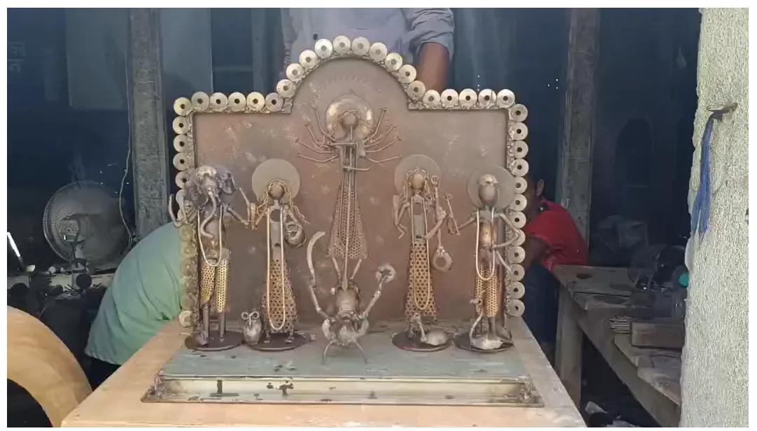 রাজুর এই কাজ প্রথম নয় এর আগেও বিভিন্ন ফেলে দেওয়া উপকরণ দিয়ে বড় দুর্গা, বড় সরস্বতী বানিয়েছে সে। এই প্রতিমায় ব্যবহৃত হয়েছে ফেলে দেওয়া নাট বল্টু, জিআই তার, কাঠ লোহার ব্লেড, মরচে ধরা পেরেক, লোহার জালি সহ আরও অনেক অব্যবহৃত উপাদান। শিল্পীর সৃজনশীলতায় এই সব জঞ্জাল যেন নতুন প্রাণ পেয়েছে।