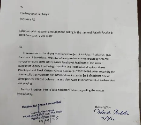 নিজস্ব প্রতিনিধি: জয়েন্ট বিডিওর নাম করে গ্রাম পঞ্চায়েতের প্রধান, উপপ্রধানদের ফোন, মোটা টাকা দিলেই মিলবে সরকারি চাকরি। চাঞ্চল্যকর ঘটনা পাঁশকুড়া ব্লকে। পাঁশকুড়া ব্লকের জয়েন্ট বিডিও পলাশ পোদ্দার তার অভিযোগ যে, পাঁশকুড়া ব্লকের গ্রাম পঞ্চায়েতের প্রধান, উপপ্রধানদের কাছে তার নাম করে ফোন করছে কেউ বা কারা। ফোনের ওপার থেকে বলছেন মোটা টাকা দিলেই মিলবে সরকারি চাকরি। প্রধান উপপ্রধানদের নামেই চাকরি এসেছে। আপনারাও করতে পারেন বা আপনার আত্মীয় পরিজনকেও দিতে পারেন। দ্রুত টাকা দিন জেলা শাসকের দপ্তরে গিয়ে নাম পাঠাতে হবে। যদিও গ্রাম পঞ্চায়েত প্রধানরা বিডিওর দারস্ত হয় তারপরে বিষয়টা জানতে পেরে জয়েন্ট বিডিও পলাশ পোদ্দার পাঁশকুড়া থানাতে লিখিত অভিযোগ জানায়।